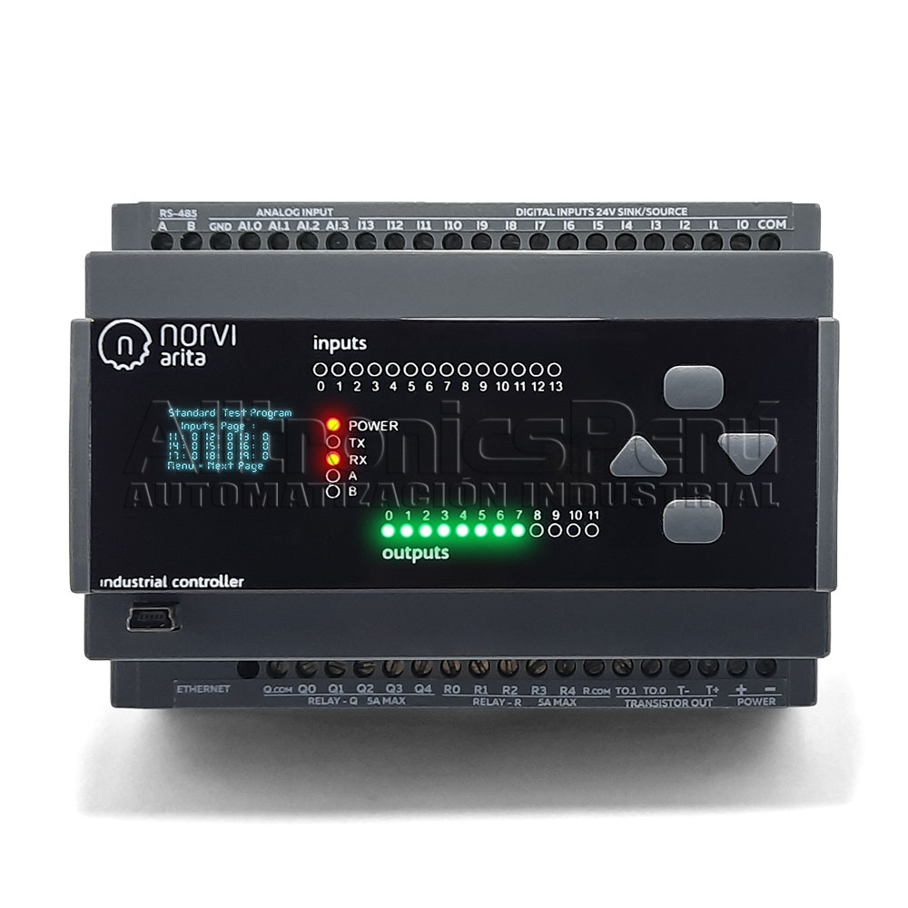 El NORVI ARITA-MEGA-M8 es un controlador programable robusto. Cuenta con un microcontrolador ATMEGA2560-16AU y comunicación RS-485. Posee amplias entradas digitales y analógicas, pantalla OLED y soporte para tarjeta microSD. Integra un RTC con batería de respaldo, ideal para aplicaciones industriales exigentes.
